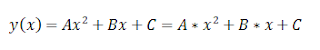 Para traçarmos o gráfico desta função, basta considerar A, B e C como dados de entrada e a saída da pela equação da função. De forma que para cada novo valor de x é calculado um valor de y(x), usando os mesmos valores de A, B e C: